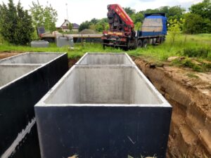 Nasza firma tworzy również również zbiorniki dwukomorowe na szambo betonowe, deszczówkę, gnojowicę i inne ciecze wodne o pojemności od 2 m3 do 12 m3.